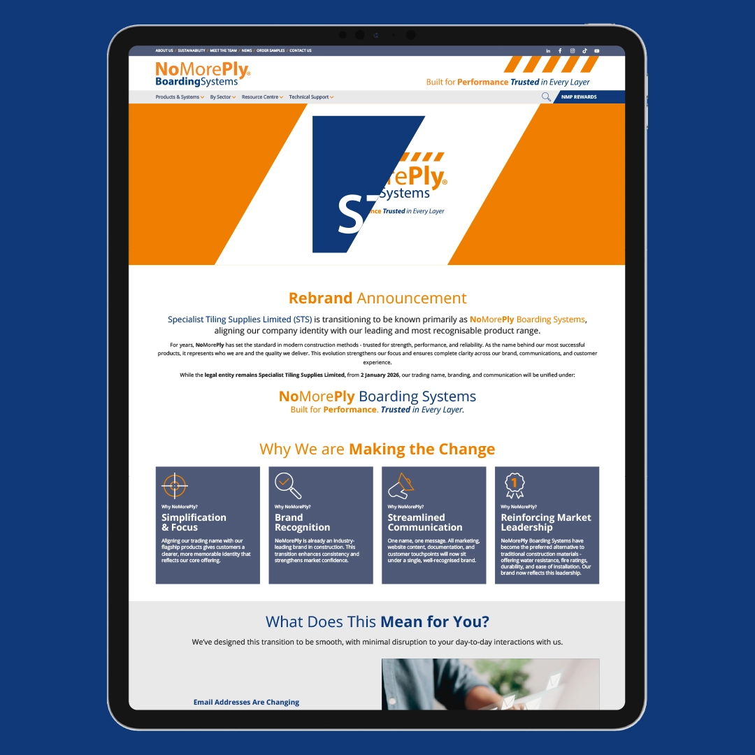 Specialist Tiling Supplies Limited (STS) is now to be known primarily by its leading and highly recognisable brand name, NoMorePly Boarding Systems. This strategic move was driven by the unparalleled success, reputation, and recognition of the NoMorePly product range.