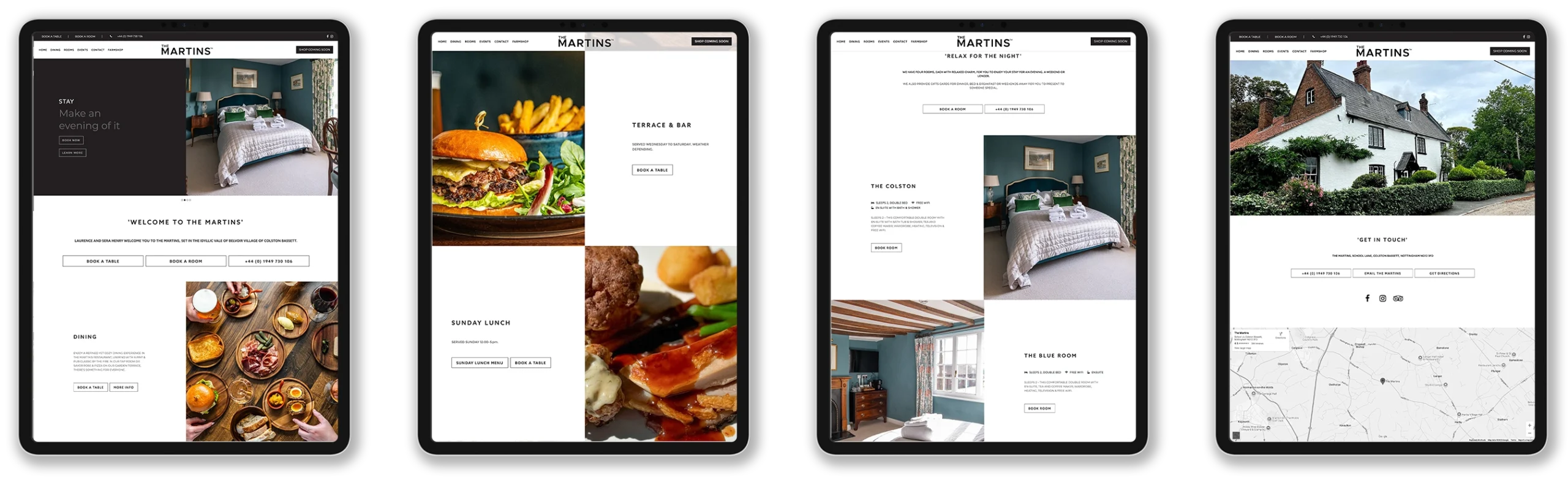 After developing the new brand, Darke Creative’s attention was to redesig the website. Taking the new refined look for The Martins, the designer and web developers created a clean and easy to use website. Clear direction for customers to book a table or book a stay.
